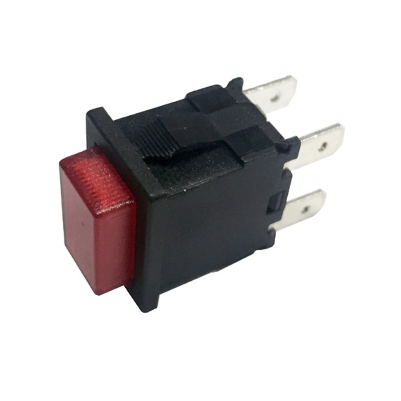 druk schakelaar zwart (2-polig) rood verlicht. 4 connectoren. 4A 220V – 250V VAC. Afmeting inbouw uitsparing: 19x13mm