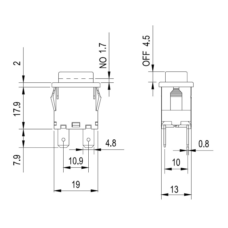 Drukschakelaar aan/uit zwart (2-polig). 4 connectoren. 4A 220V – 250V VAC. Afmeting inbouw uitsparing: 19x13mm