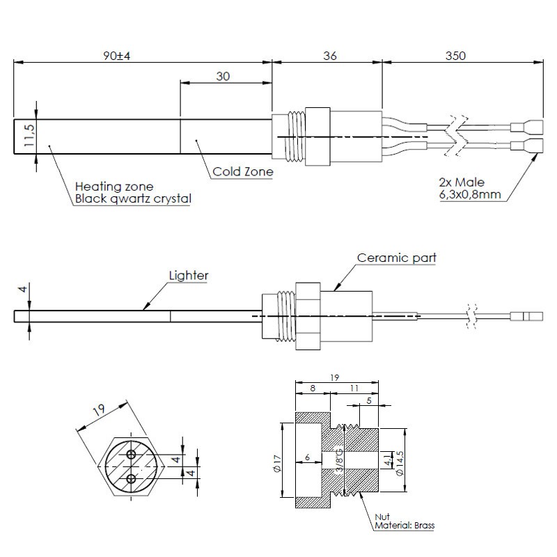 Diameter: 11,50 x 4 mm. Totale lengte: 126mm. Lengte incl. schroefdraad: 103mm. Vermogen: 400 Watt. Temperatuur tot: 1000°C. Air-tight versie. Geproduceerd: EU.