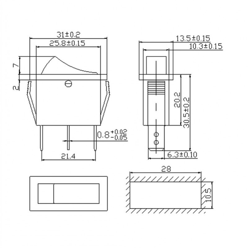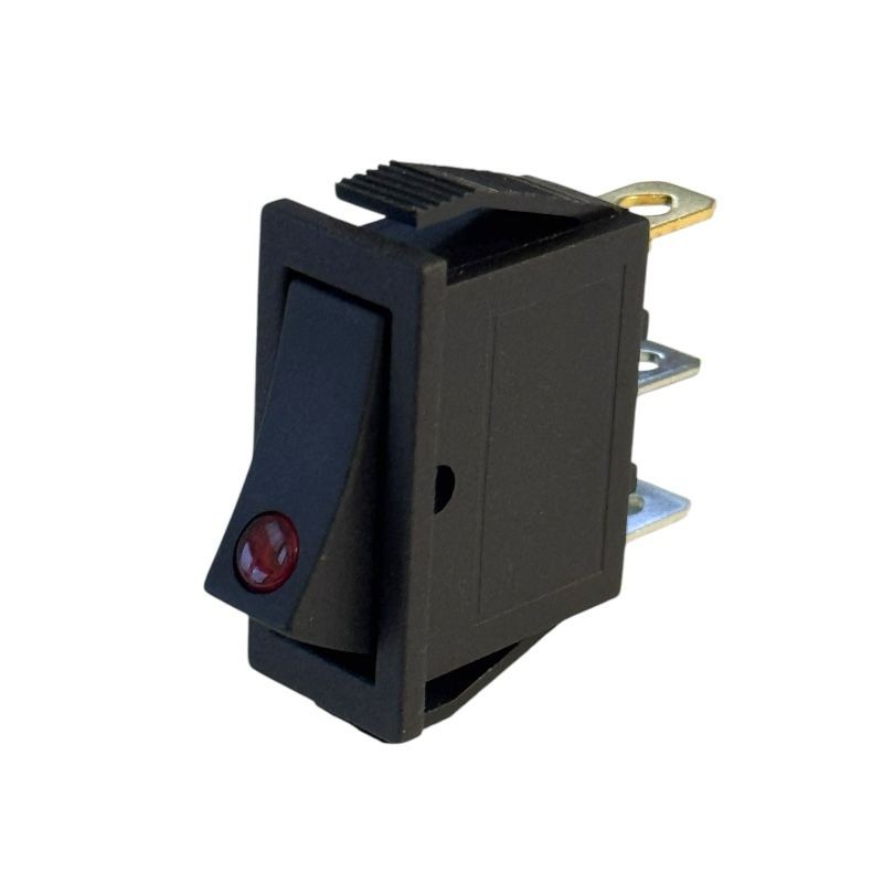 Schakelaar aan/uit zwart met signaal verlichting. 3 connectoren. 16A 220V – 250V VAC. Afmeting inbouw uitsparing: 28×10.5mm